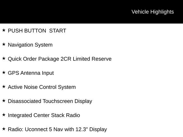 The Quick Order Package 2CR Limited Reserve equips this Grand Cherokee L with a host of premium features, including a 2.0L Hurricane 4 Turbo engine with ESS, an 8-Speed Automatic transmission, and a Surround View Camera System for unparalleled visibility. The Nappa Leather-trimmed interior, combined with the Ventilated Front Seats and Heated Steering Wheel, ensures exceptional comfort and luxury.